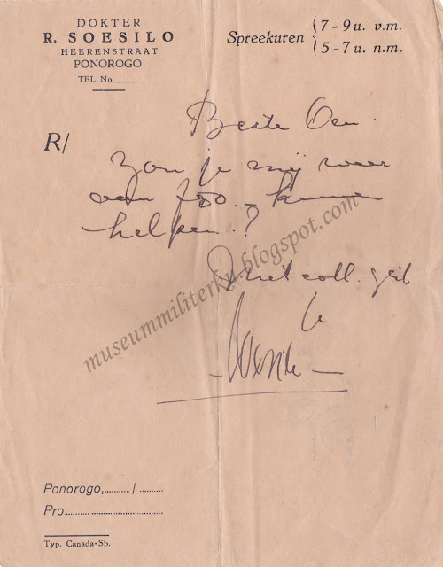 Koleksi yang saya punya mengenai dia adalah surat pribadi dari rekan sejawat dia yaitu Dokter R. Soesilo dari Ponorogo. Isi surat tersebut adalah permintaan pinjaman uang sebesar f. 50 kepada Dr. Oen. Uniknya Soesilo menulis surat tersebut pada kertas resep.
